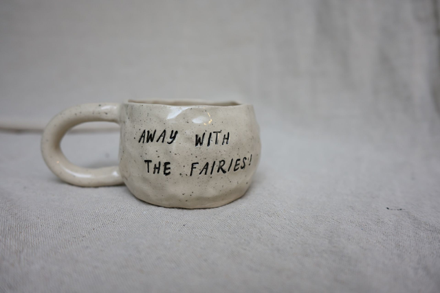 A hand shaped mug with a handle, formed slowly by hand and marked with the sentence AWAY WITH THE FAIRIES. Each piece carries natural variations, texture, the way it feels in the palm, making every mug one of a kind.
