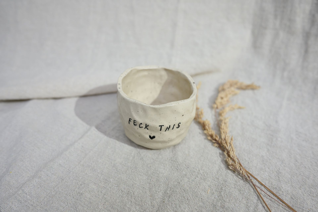 A hand-shaped sip cup made without a handle, formed slowly by hand and finished with a sentence of FECK THIS impressed into the clay. Designed to sit comfortably in the hands and be used every day.