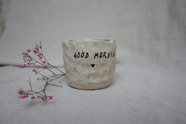 A hand-shaped sip cup made without a handle, formed slowly by hand and finished with a sentence GOOD MORNING impressed into the clay. Designed to sit comfortably in the hands and be used every day.