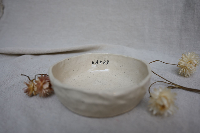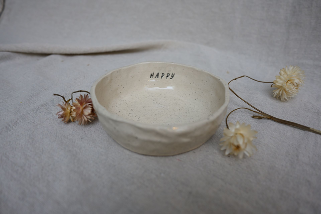 A handbuilt bowl made slowly by hand, with the word happy pressed into the clay. It’s meant to bring a small moment of warmth and joy to everyday use.