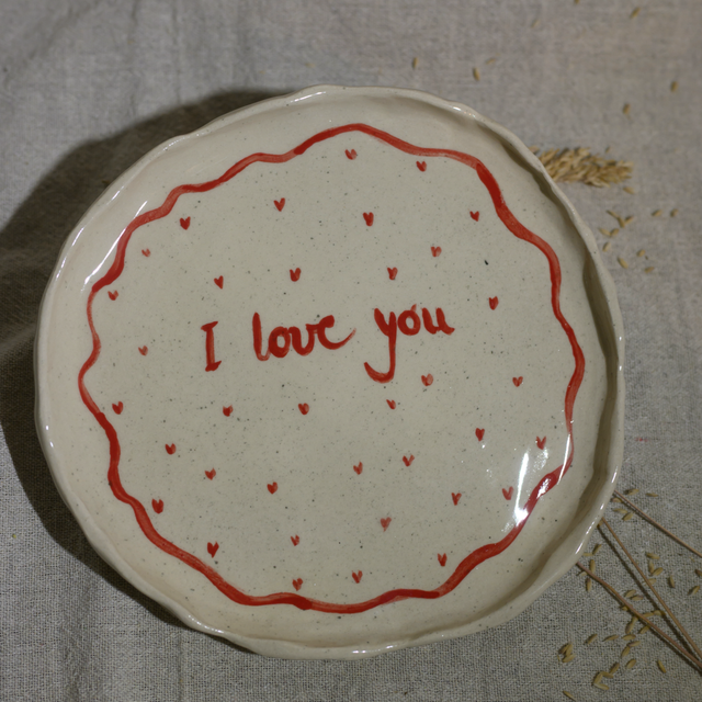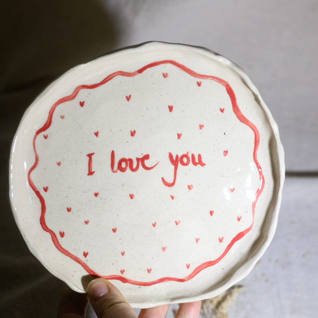 A hand-shaped plate made using pinch method, formed slowly by hand and finished with a sentence of i LOVE YOU painted on the clay. Designed to be used every day.