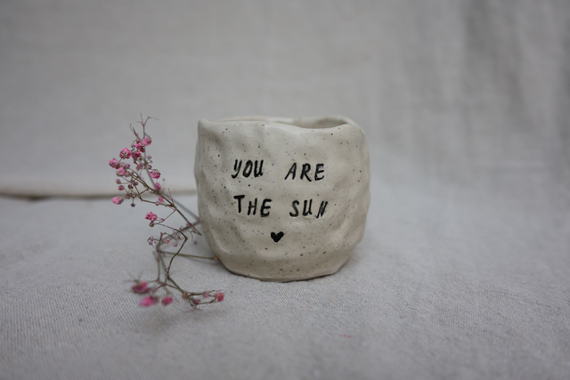 A hand-shaped sip cup made without a handle, formed slowly by hand and finished with a sentence of YOU ARE THE SUN impressed into the clay. Designed to sit comfortably in the hands and be used every day.